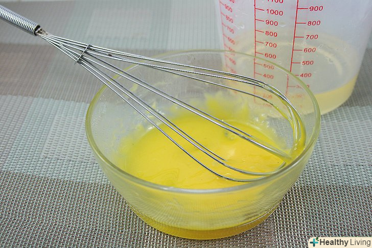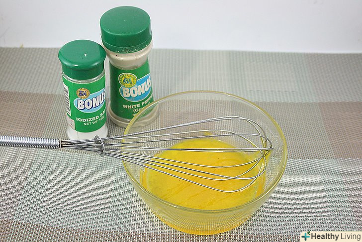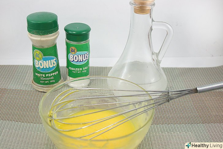 Перемішайте інгредієнти.коли інгредієнти досягнуть кімнатної температури, змішайте 2 дрібних або 1 великий жовток з 1 чайною ложкою (5 г) солі і 1 чайною ложкою (5 г) білого перцю в мисці середнього розміру за допомогою віночка.