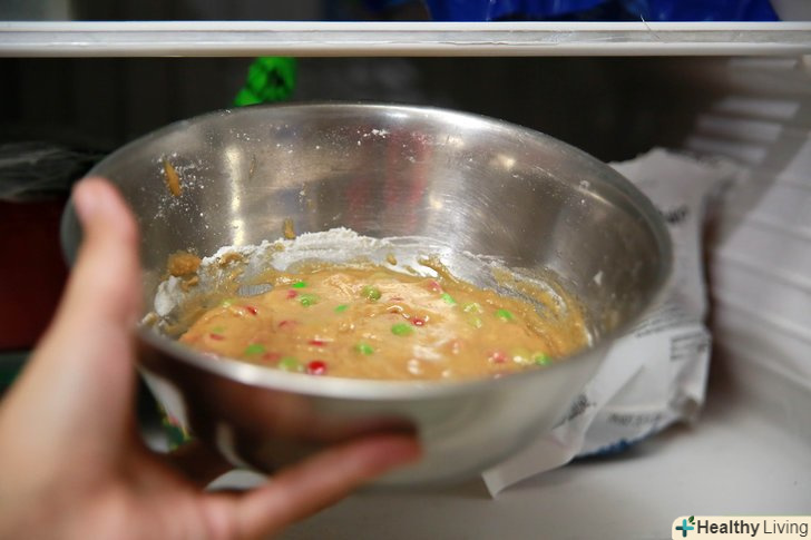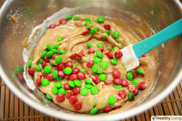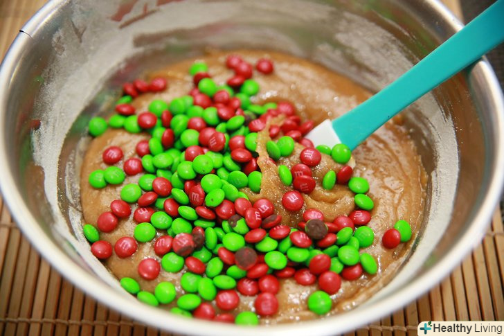 Перемішайте разом рідкі і сухі інгредієнти, додайте M amp;Ms.для перемішування маси використовуйте дерев'яну ложку або пластмасову лопаточку. Замісити тісто.- Додайте Mamp; M's і швидко перемішайте, щоб драже ретельно розподілилося по всьому об'єму.