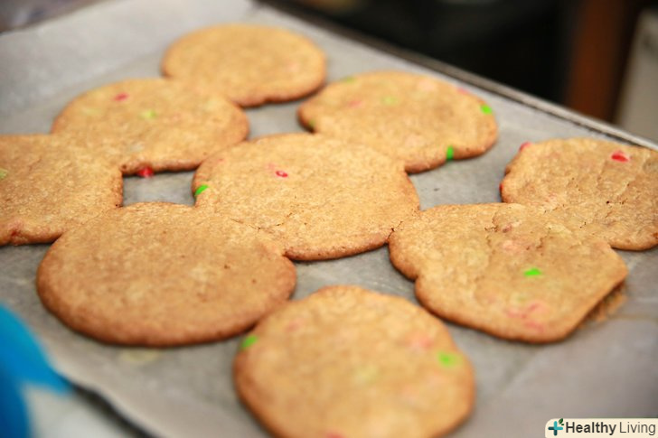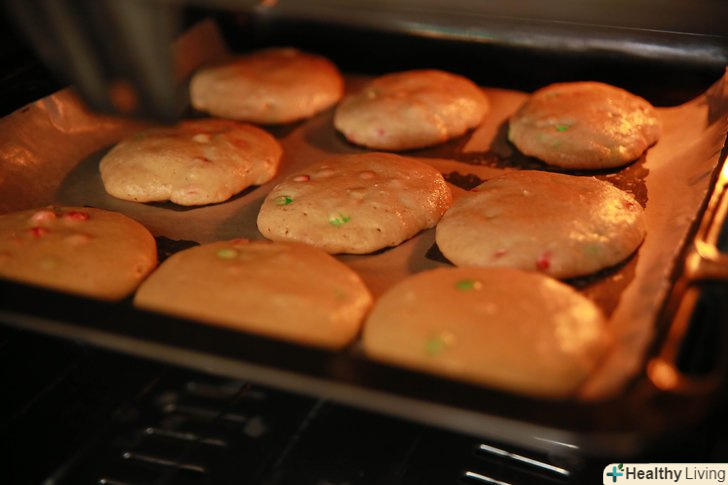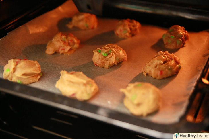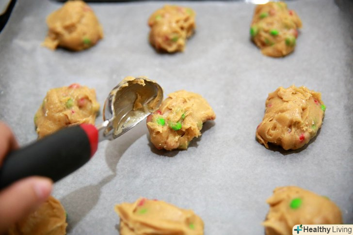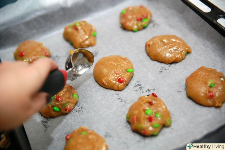 Викладіть печиво на деко.якщо ви не підготували деко раніше, то прийшов час зайнятися цим: просто застеліть його пергаментним папером або як слід змастіть, щоб печиво не прилипло. Візьміть велику ложку (підійде столова ложка), щоб викладати печиво. Ви також можете зробити це руками. Якщо хочете, ви можете додати ще M amp; M's і трохи втиснути їх в тісто для прикраси.- Зазвичай при випічці таке печиво розповзається, тому залишайте досить великі проміжки.