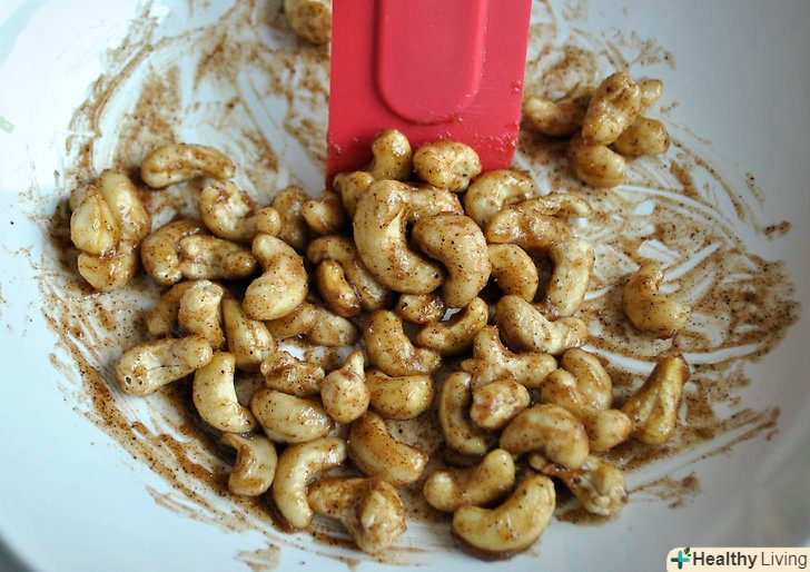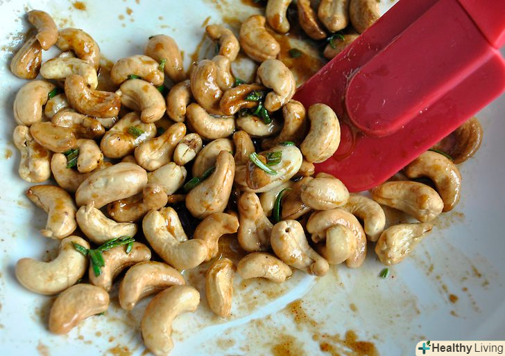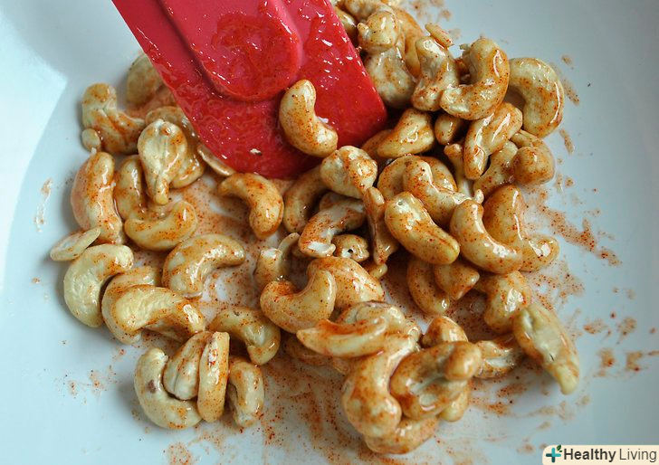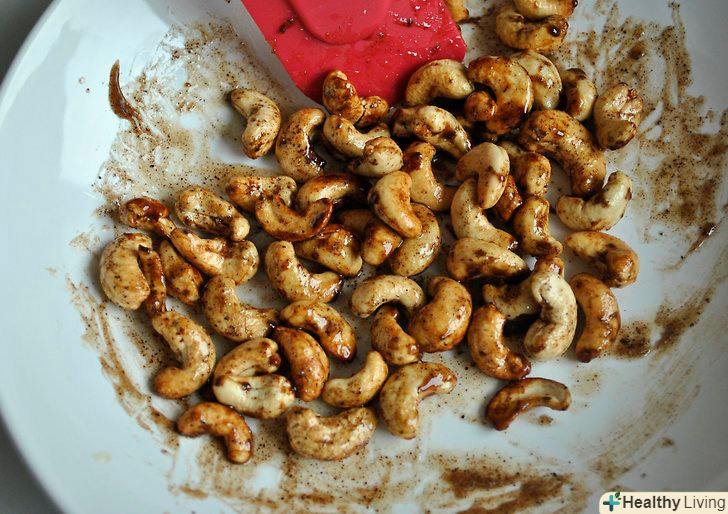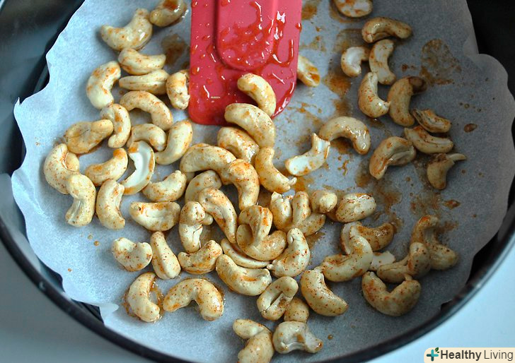 Додайте кешью.висипте горіхи в миску. Змішайте їх з сумішшю меду і кайенского перцю таким чином, щоб рівномірно розподілити соус, а потім перенесіть горіхи на попередньо підготовлений деко.- Викладайте кешью на деко рівномірно, в один шар. В іншому випадку кешью не прожаряться рівномірно; частина горіхів підгорить, або навпаки, залишиться сирими.