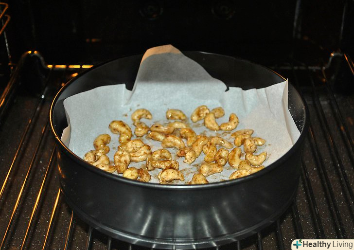 Підсмажуйте кешью 5-10 хвилин або до готовності.горіхи повинні трохи потемніти і придбати пряний аромат.- Перемішуєте горіхи кожні три-п'ять хвилин до повної готовності. Якщо цього не робити, то з великою ймовірністю кешью підгорять або приготуються нерівномірно.