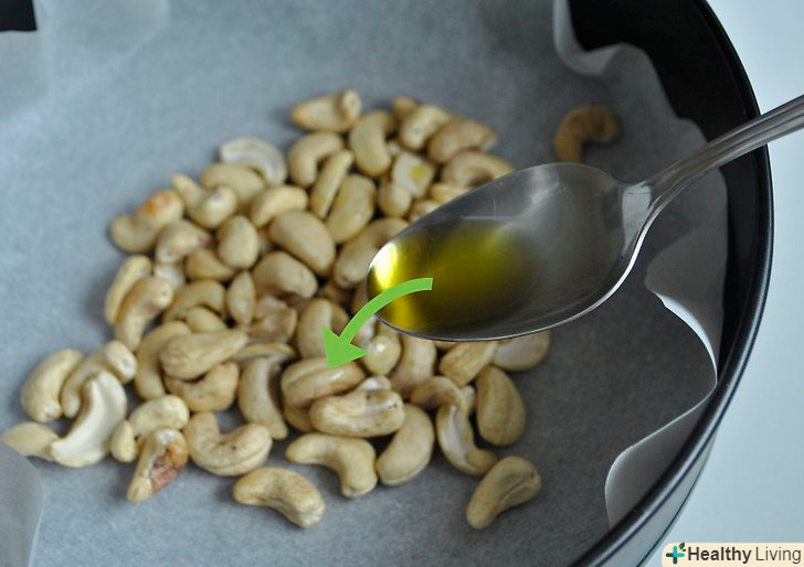 Спробуйте додати масло.обсмажувати кешью в невеликій кількості масла бажано, але не обов'язково. Додайте поверх горіхів одну або дві (5 або 10 мл) чайні ложки олії. Перемішайте і рівномірно розподіліть кешью на деку, щоб повністю покрити поверхню маслом.- Смак стане набагато краще, якщо смажити горіхи в маслі, але маслянистість кінцевого продукту значно збільшиться. Якщо горіхи використовуються в якості інгредієнта для випічки (наприклад, додаються в печиво або тістечка), то в такому випадку слід повністю виключити масло і пропустити цей крок. Смажте горіхи в маслі, якщо вживаєте їх в якості самостійної закуски або використовуєте як гарнір.[3]