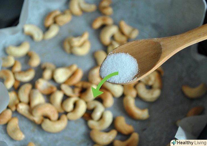 Пересипте горіхи цукром і сіллю.дістаньте кешью і остудіть протягом п'яти хвилин, після чого присипте цукром і сіллю. Акуратно перемішайте, щоб розподілити приправу.- Спробуйте попередньо змішати сіль і цукор в невеликій, чистій мисці. Це дозволить в подальшому більш рівномірно розподілити суміш по поверхні кожного кешью.