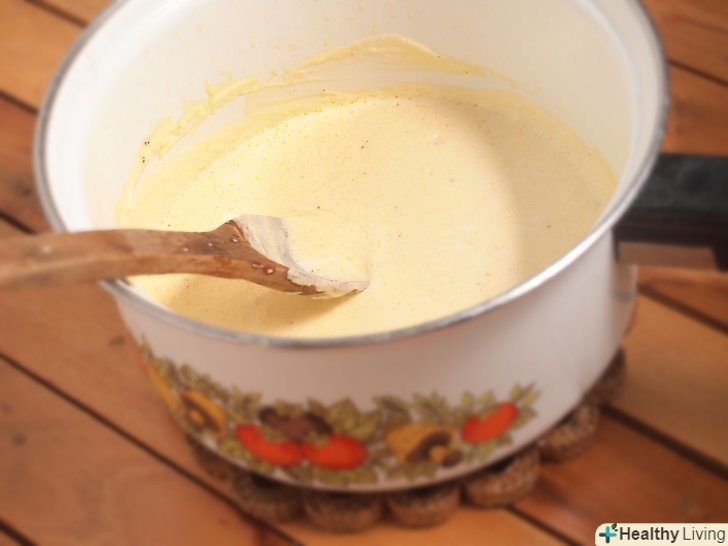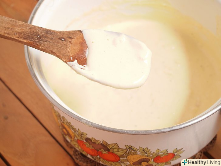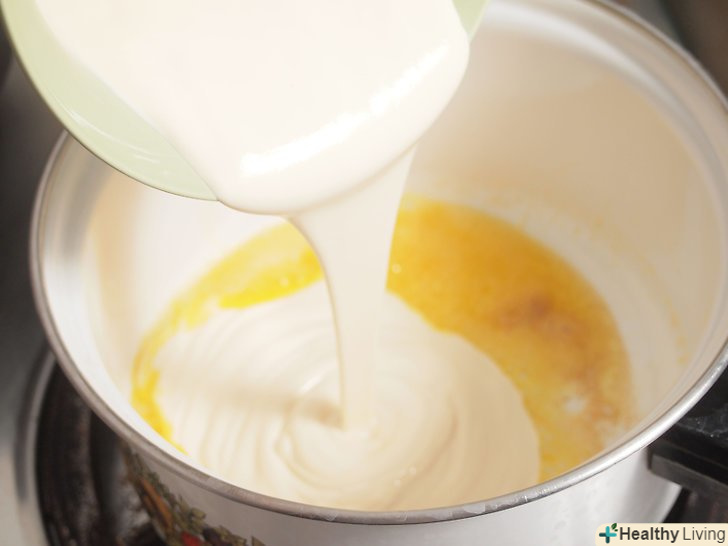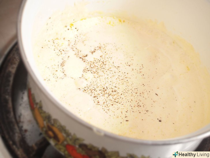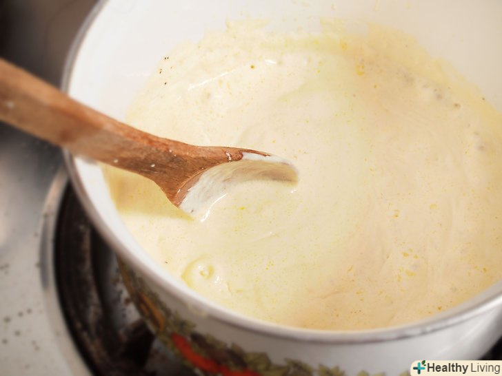Повільно додайте в сковороду вершки, постійно помішуючи дерев'яною ложкою.