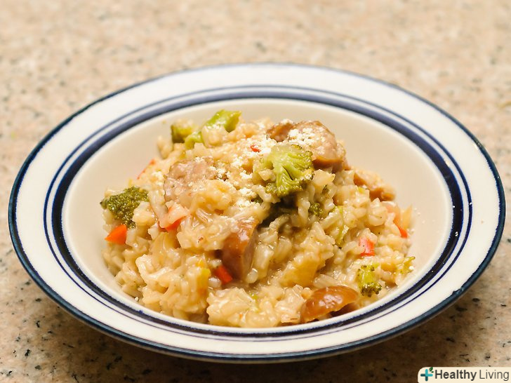 Приготуйте грибне різотто з рису арборіо.застосуйте прийом "каструля в каструлі", насипте у внутрішню ємність масло, цибулю і часник і обсмажуйте їх протягом 2 хвилин на середньому вогні. Потім додайте гриби і пасеруйте продукти ще 3 хвилини. Візьміть арборію або рис для різотто і насипте його у внутрішню каструлю з відповідною кількістю води або бульйону. Готуйте страву протягом 8 хвилин.- Додавши всі інгредієнти в каструлю, закрийте і щільно зафіксуйте кришку, включіть пальник на повний вогонь, щоб забезпечити високий тиск, а потім зменшіть вогонь для підтримки тиску в ємності.