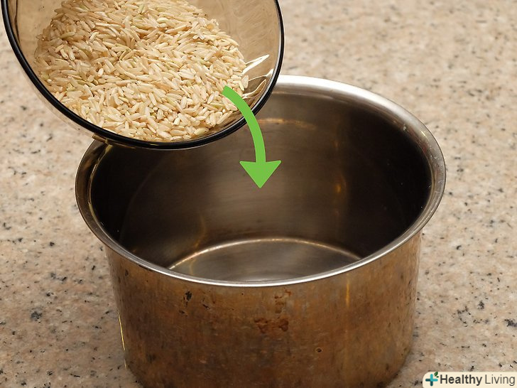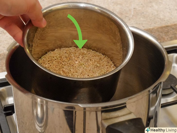 Насипте рис і налийте воду в жароміцну ємність.поставте в скороварку жароміцну каструлю або миску відповідного обсягу. Насипте рис і налийте необхідну кількість води згідно виду і кількості рису (наприклад, на один стакан білого рису необхідно 1,5 склянки води).[6]- Щоб блюдо вийшло ідеальним, скористайтеся ємністю з нержавіючої сталі, оскільки метал проводить тепло краще скла або кераміки.