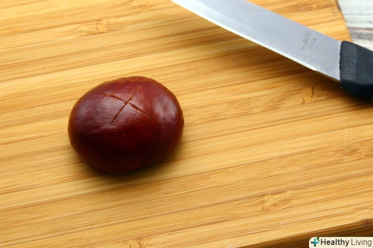 Зробіть Х-подібний надріз на кожному каштані.Візьміть дуже гострий ніж для чищення овочів або скористайтеся великим кухарським ножем (в цьому випадку надріз потрібно робити гострим краєм підстави леза). Зробіть два пересічних надрізу довжиною близько 1,25 сантиметрів кожен на плоскій стороні кожного каштана. Якщо не зробити цього, каштани лопнуть в духовці під впливом гарячої пари, що утворився під шкаралупою.- Шкаралупа каштанів дуже тверда. Починайте робити надріз кінчиком леза і будьте обережні, щоб не поранити пальці.