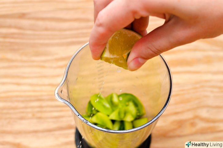 Наріжте лайм на часточки.розріжте лайм навпіл, а потім покладіть плоскою стороною вниз і розріжте кожну половинку ще раз навпіл. Вичавіть сік лайма в блендер.