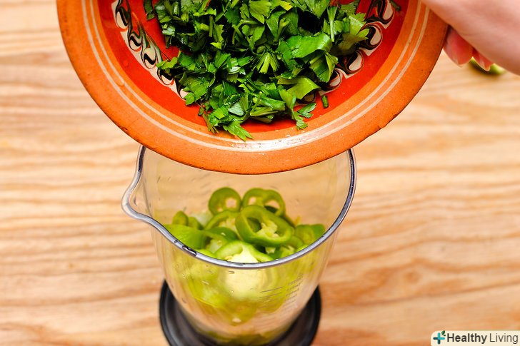 Наріжте 3 перцю серрано Чилі.видаліть стебла і промийте перець у холодній воді. Наріжте разом з насінням. Покладіть нарізаний перець в блендер разом з іншими інгредієнтами.