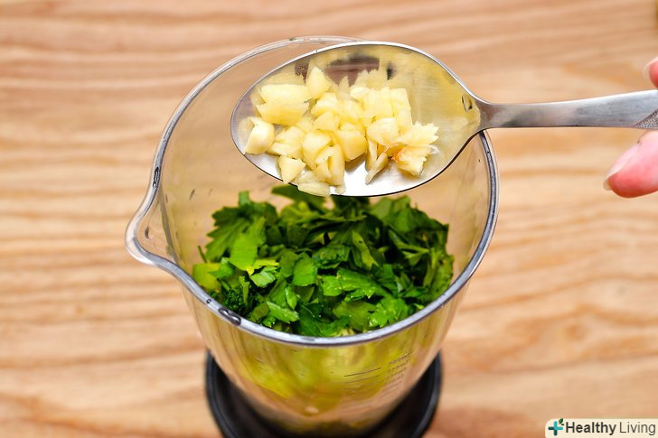 Наріжте часник.дрібно наріжте 1 зубчик часнику і покладіть його в блендер до решти інгредієнтів.
