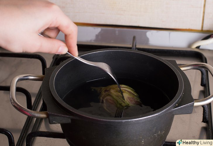 Перевірте, чи не зварилися артишоки.Артишок вважається готовим, коли його листок можна з легкістю відокремити від середини. Візьміть вилку або відокремте Центральний лист вістрям ножа.[6]- Будьте обережні, коли будете перевіряти артишоки на готовність. Оскільки артишоки варилися в окропі, вони можуть вас ошпарити. готовність артишоку також можна перевірити, проткнув підставу овоча ножем.[7]