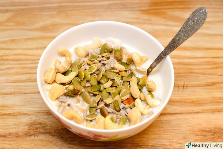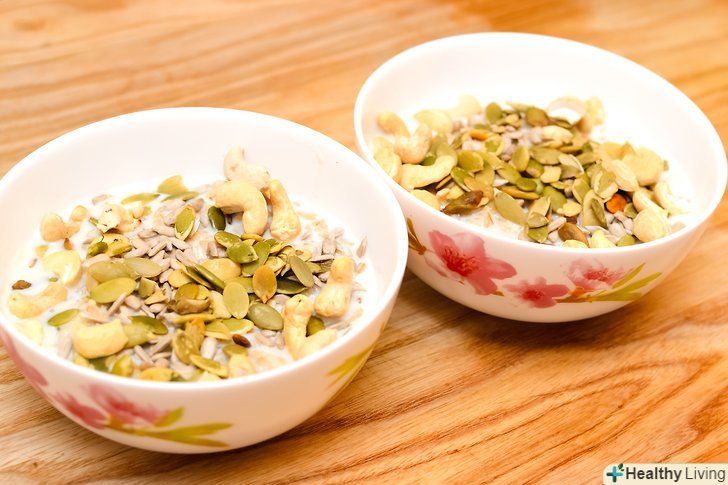 Додайте суміш ваших улюблених горіхів і насіння і трохи молока. спробуйте кешью, насіння соняшнику, насіння конопель, лляне насіння, гарбузове насіння, все те, що ви можете обсмажувати в духовці, коли запікаєте що-небудь ще.