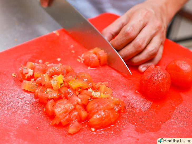Наріжте помідори.видаліть кісточки і потім додайте нарізані кубиками помідори в миску з сальсою.