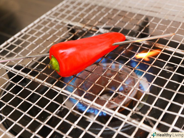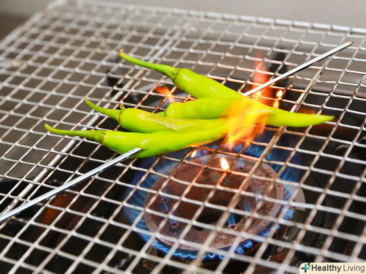 Очистіть перці чилі від шкірки над газовим пальником.- Насадіть перці чилі на довгий металевий шампур.