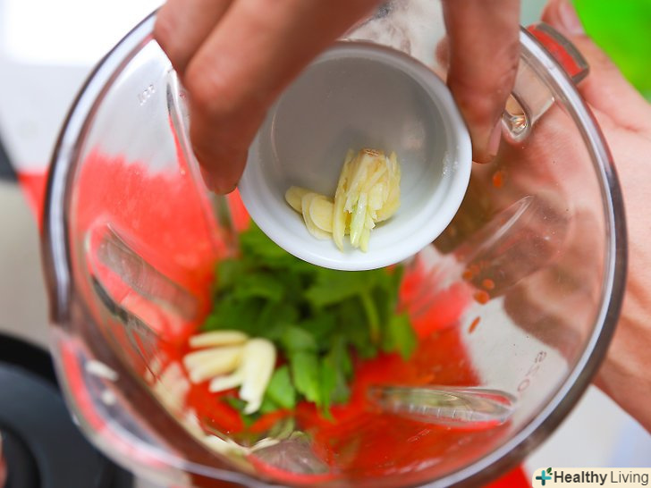 Помістіть помідори, часник і кінзу (коріандр) в міксер або кухонний комбайн.