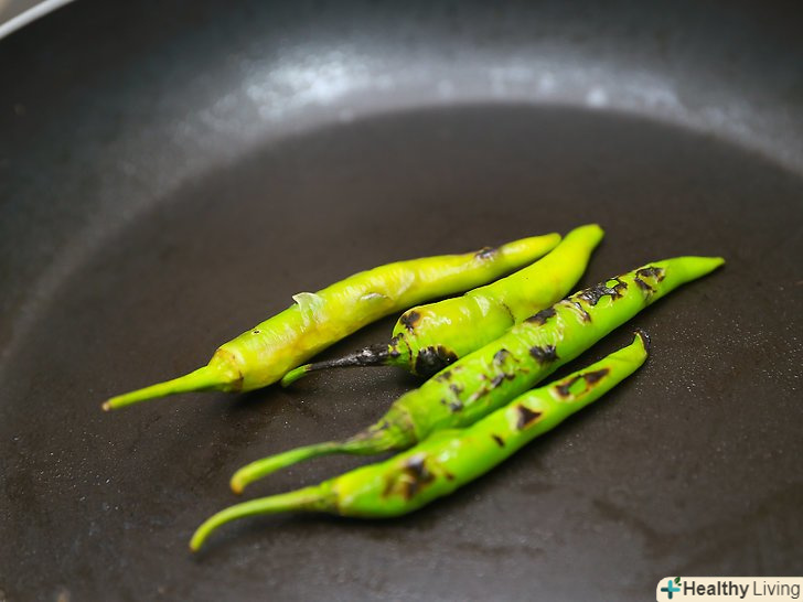 Обсмажте перці чилі всуху на сковороді-грилі.коли шкірка перців обгорить і почорніє – приберіть їх з вогню.