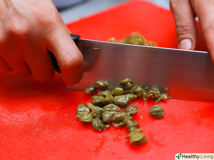 Грубо наріжте каперси і корнішони.втім, якщо каперси виявляться занадто маленькими, то немає ніякої необхідності їх різати.