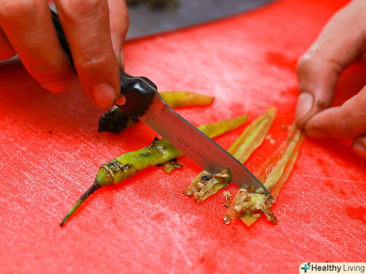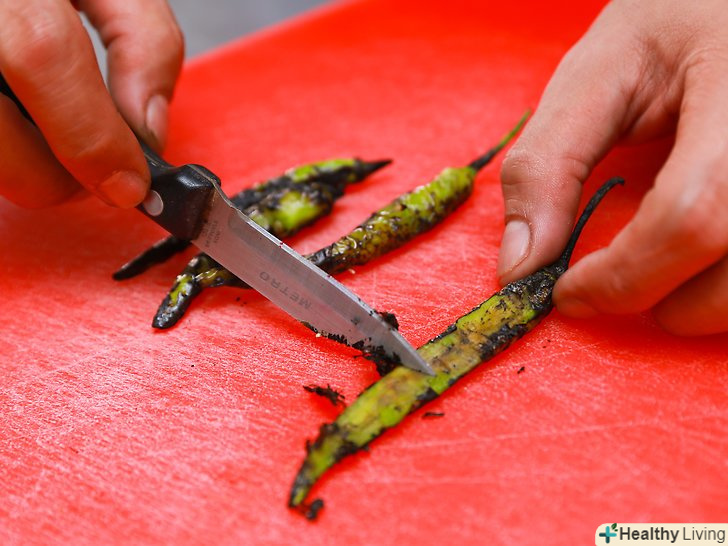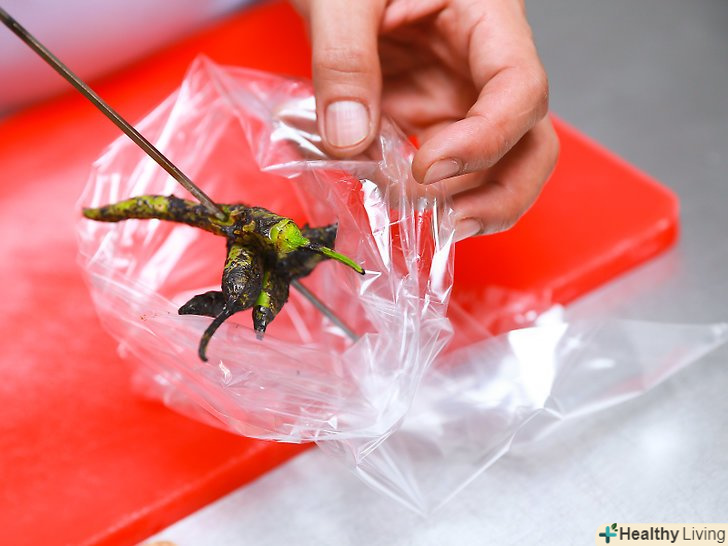 Через 20 хвилин вийміть перці чилі з пакета і очистіть їх від шкірки.- Капсаїцин, що міститься в перцях Чилі, може викликати сильне роздратування на шкірі і очах. Не тріть ваші очі і ніс, забувши про те, що ваші пальці покриті соком від перців чилі!
