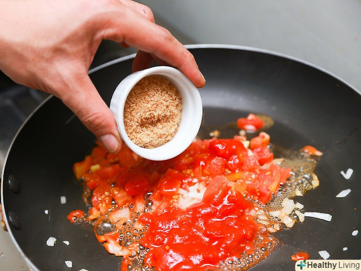 Покладіть цибулю в каструлю. Додайте помідорів і цукру. Варіть на повільному вогні, поки вода не загусне. Регулярно перемішуйте.