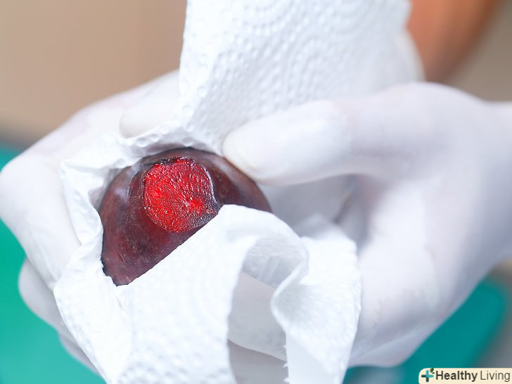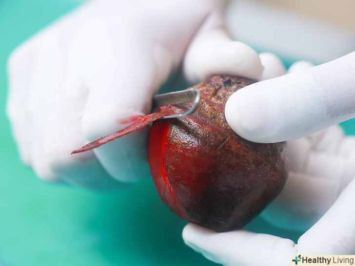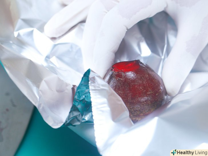 Очистіть буряк.коли буряк досить охолоне, зніміть зовнішній шар шкірки. Утримуйте кожну буряк в паперовому рушнику і акуратно приберіть шкірку з країв рушника. Шкірка повністю готової буряка повинна зніматися без будь-яких труднощів. Вам не потрібен буде ніж або інший гострий предмет, щоб зробити це. Ви можете надіти рукавички, щоб уникнути попадання бурякового соку на ваші руки.