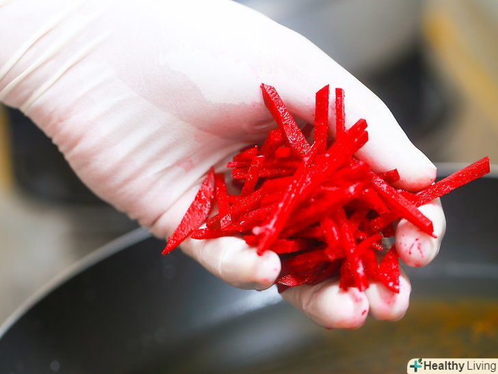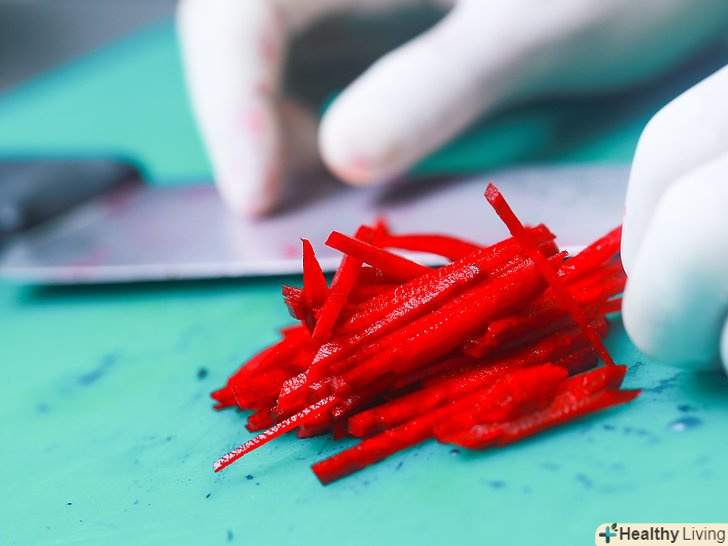 Наріжте буряк на смуги розміром з сірник.смужки повинні бути близько 8 см. в довжину і 1-2 см.товщиною. Більш широкі смуги буде легше смажити, вони не згорять, але їх приготування може зайняти трохи більше часу.