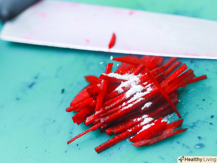 Посипте смуги кукурудзяним крохмалем.покладіть 1/4 склянки (60 мл) кукурудзяного крохмалю в металеву або темну миску. Уникайте пластмасових мисок, так як сирий буряковий сік, швидше за все, залишить плями на пластику. Додайте смуги буряка в миску і акуратно підкидайте їх в кукурудзяному крохмалі за допомогою вилки, поки вони злегка не покриються.