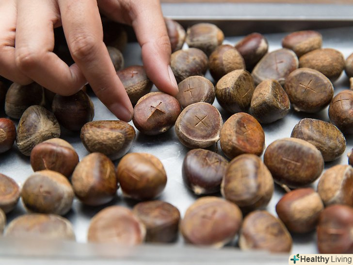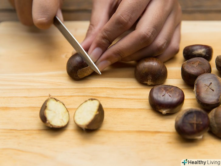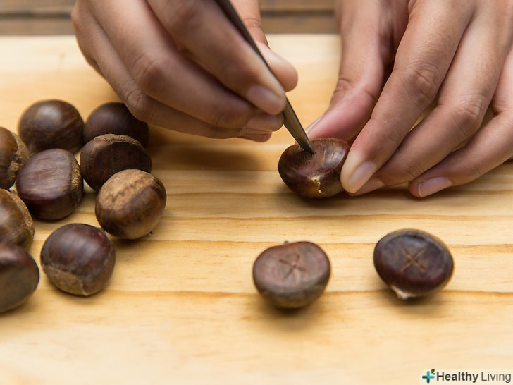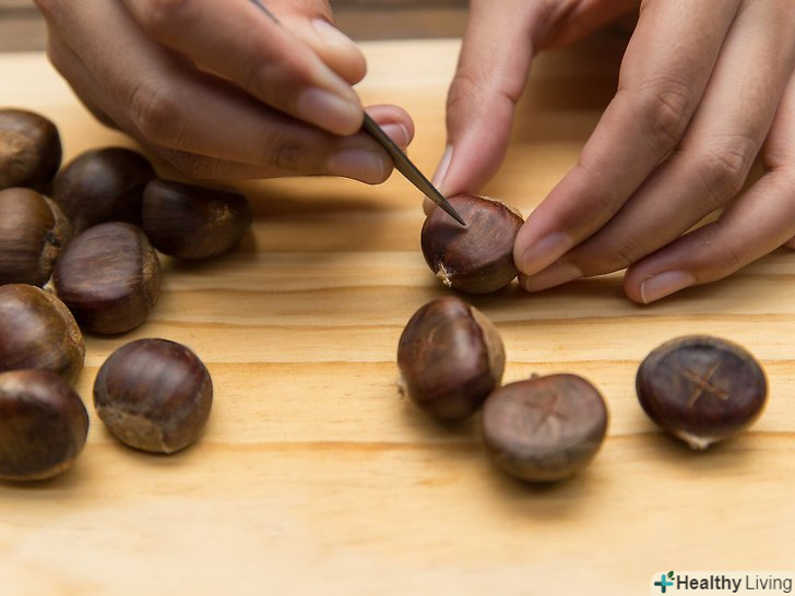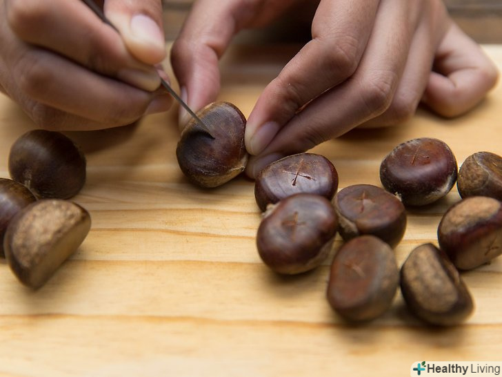 Зробіть х-подібний надріз на плоскій стороні кожного каштана. Робіть це гострим ножем. Так ви швидше приготуєте каштани, так як через розріз буде виходити пар. Ви також можете просто проколоти кожен каштан кілька разів виделкою.