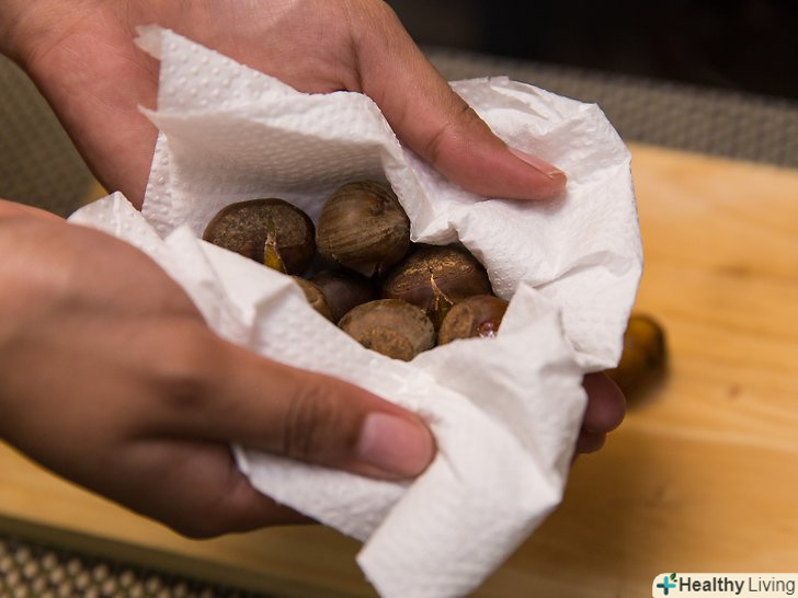 Роздушіть оболонку.Дайте каштанам охолонути протягом 2-3 хвилин, а потім загорніть їх у рушник і Стисніть, щоб роздрібнити оболонку. Залиште їх в рушник ще на п'ять хвилин.