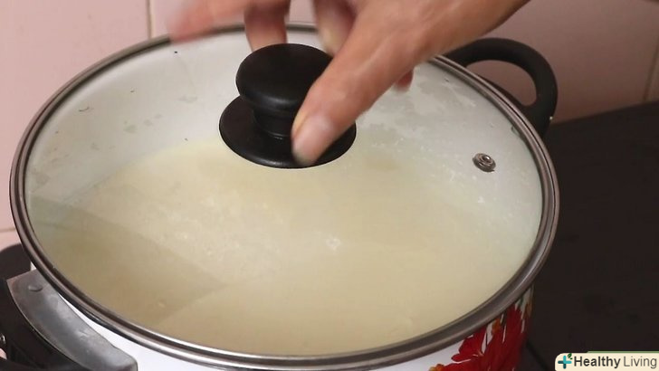 - Починайте варити соєве молоко.Налийте соєве молоко у велику каструлю і нагрійте його на слабкому вогні. Температура повинна бути близько 60 градусів за Цельсієм.
