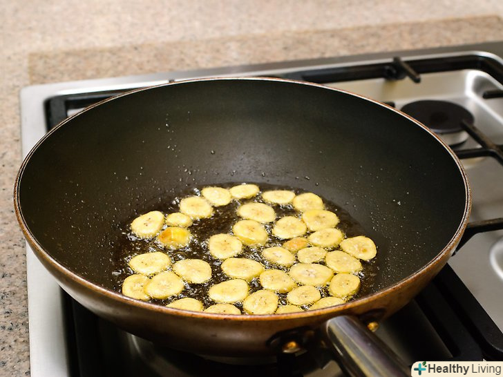 Розігрійте масло.кладіть банани в масло по кілька кружечків (не висипайте все відразу). Додавайте і діставайте банани за допомогою шумівки.