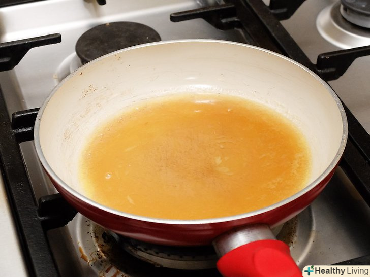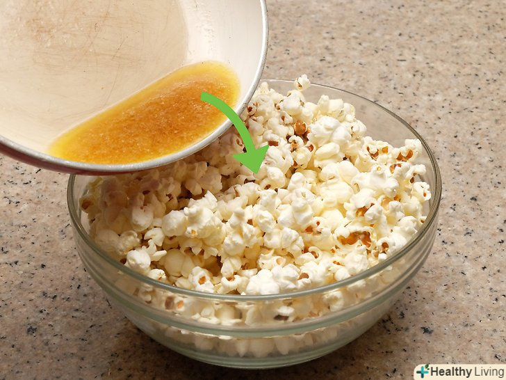 Розтопіть масло з залишками цукру. змішайте ⅓ склянки (75 г) масла і ⅛ склянки (2 столові ложки / 25 г) цукрового піску. Нагрійте і перемішайте їх в сковороді до повного розчинення або залиште на пару хвилин для приготування карамелі.[3] Все це також можна розтопити в мікрохвильовій печі приблизно за хвилину.[4]- Щоб карамель вийшла густішою, замість цукру візьміть ¼ склянки (50 г) кукурудзяного сиропу. Полийте їм звичайний попкорн або послащенний, якщо ви обожнюєте солодке.