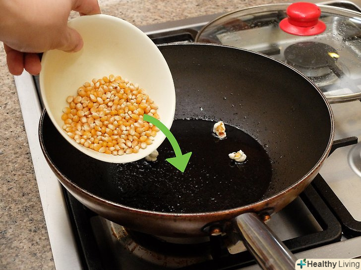 Нагрійте масло і кілька зерен в чавунній сковороді.нагрійте 3 столові ложки (45 мл) рослинного масла і три зернятка попкорну у великій сковороді з товстим дном і кришкою. Коли всі три зернятка лопнуть, ви зрозумієте, що сковорода досить нагрілася і можна додавати інші.- Найкраще використовувати рапсове масло або інше рослинне масло з середньою або високою точкою димлення.