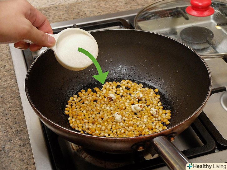 Додайте ¼ склянки (50 г) цукру і розігрівайте, поки всі зерна не лопнуть.як тільки перші зерна почнуть лопатися, додайте гранульований білий цукор і гарненько перемішайте. Незабаром зерна знову почнуть лопатися, але через якийсь час сповільняться до одного разу в 1-2 секунди. Пересипте попкорн в миску і відкладіть в сторону. Не знімайте сковороду з вогню, так як на гарячій сковороді цукор може все ще згоріти.- Цукор може бути дуже гарячим. Дайте йому охолонути, перш ніж почати перекушувати.