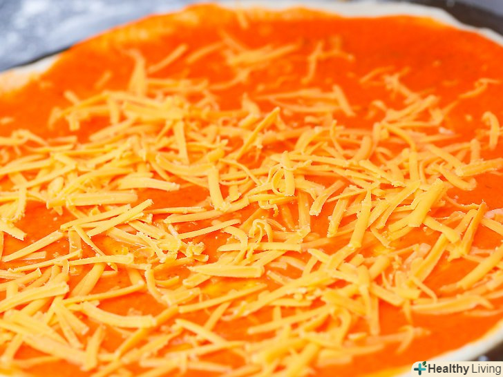 Зверху посипте соус сиром.насипте сир і рівномірно перемішайте його з соусом. Найчастіше для піци використовується моцарелла, але ви можете спробувати змішати подрібнений сир романо, пармезан, проволоне, Азіаго або кілька шматків Рікотта.