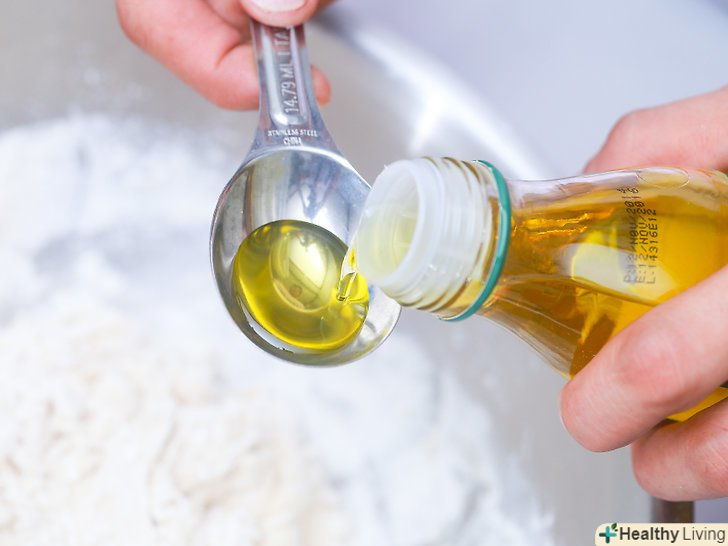 Додайте оливкову олію в тісто відразу після додавання борошна.завдяки цьому тісто не буде прилипати до рук або до миски. Продовжуйте вимішувати тісто, поки воно не стане глянсовим і гладким, але не липким. Стисніть в руці невелику його кількість, а потім розтягніть тісто так, щоб воно просвічувалося. Тісто готове, коли не рветься під час розтягування.