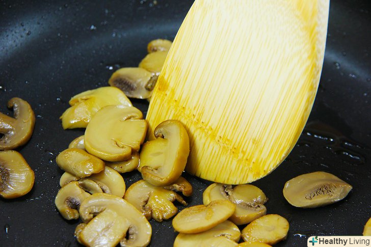 Приготуйте гриби.спочатку, почистіть гриби, але не мийте їх. Наріжте гриби скибочками і покладіть на іншу сковорідку з розігрітим рослинним маслом. Обсмажуйте гриби, струшуючи їх, на слабкому вогні протягом 5 хвилин. Потім викладіть на теплу тарілку.