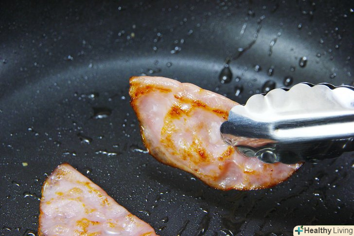 Приготуйте бекон.на ту ж сковорідку, на якій готуються сосиски, покладіть скибочки бекону і обсмажуйте їх протягом 1 хвилини, не забуваючи перевертати.