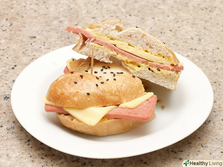 Покладіть шинку і сир поверх нижньої частини булочки.покладіть на тарілку нижню частину булочки розрізаною стороною вгору. Покладіть на неї 2 скибочки шинки, а потім 2 скибочки швейцарського сиру.- Якщо ви не любите швейцарський сир, візьміть будь-який інший, наприклад чеддер.