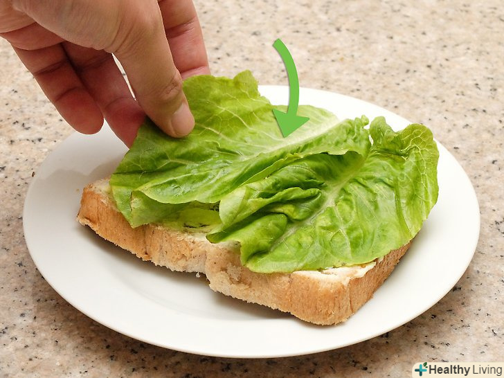 Покладіть салат-латук на нижній шматочок хліба.покладіть один зі шматочків хліба на тарілку змащеною стороною вгору. Покладіть на нього 1-2 листа салату-латуку. Якщо листя занадто великі і не поміщаються на хлібі, розріжте їх навпіл або на 3 частини.- У деяких сортів салату-латуку дуже товстий стебло. Розріжте його гострим ножем, щоб ваш сендвіч був рівним.