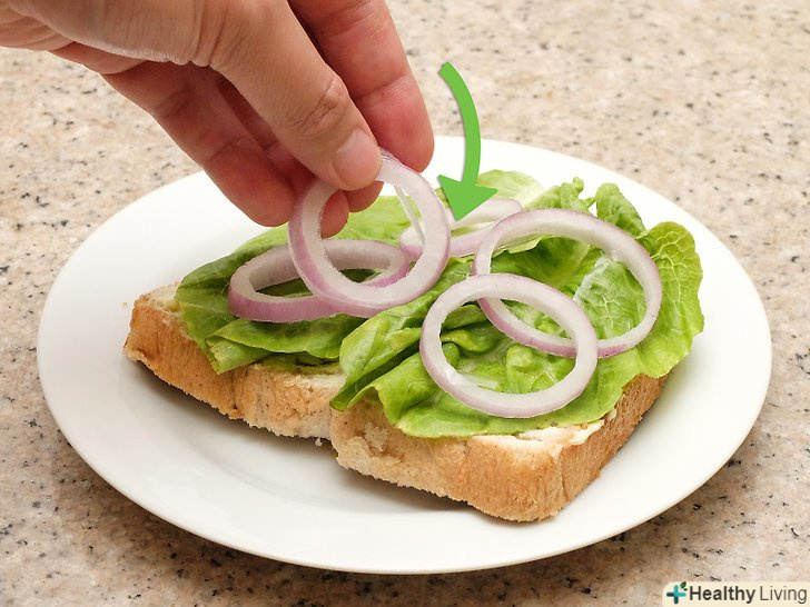 Надайте сендвічу пікантний смак за допомогою цибулі.відріжте тонкий гурток червоної цибулі. Розділіть гурток на кільця. Покладіть в сендвіч стільки кілець цибулі, скільки хочете.- Якщо хочете, можете не додавати в сендвіч цибулю.
