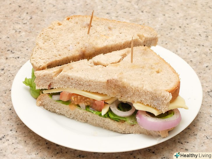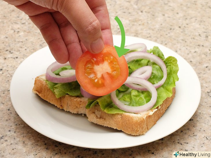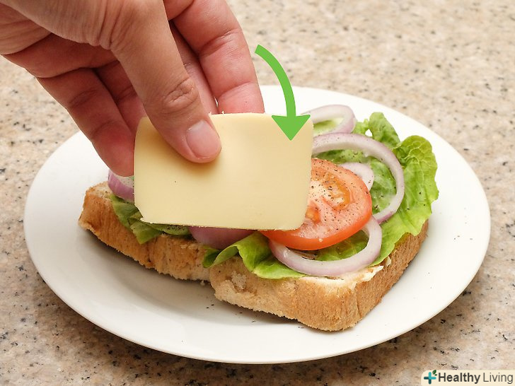 Нарешті, додайте пару скибочок сиру.акуратно покладіть на сендвіч 1-2 скибочки білого сиру чеддер. Скибочки повинні повністю покривати гуртки помідора, інакше верхній шматочок хліба швидко розмокне.- Якщо ви не любите чеддер, замініть його швейцарським сиром, сиром пармезан або легким вершковим сиром.