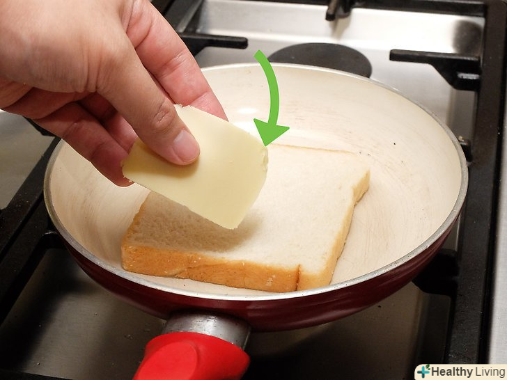 Викладіть хліб і сир на сковороду.покладіть на сковороду шматочок хліба масляною стороною вниз. Зверху покладіть 1-2 шматочки сиру чеддер.- Щоб у сендвіча був більш вишуканий смак, спробуйте замінити чеддер іншим видом сиру, наприклад пармезаном.