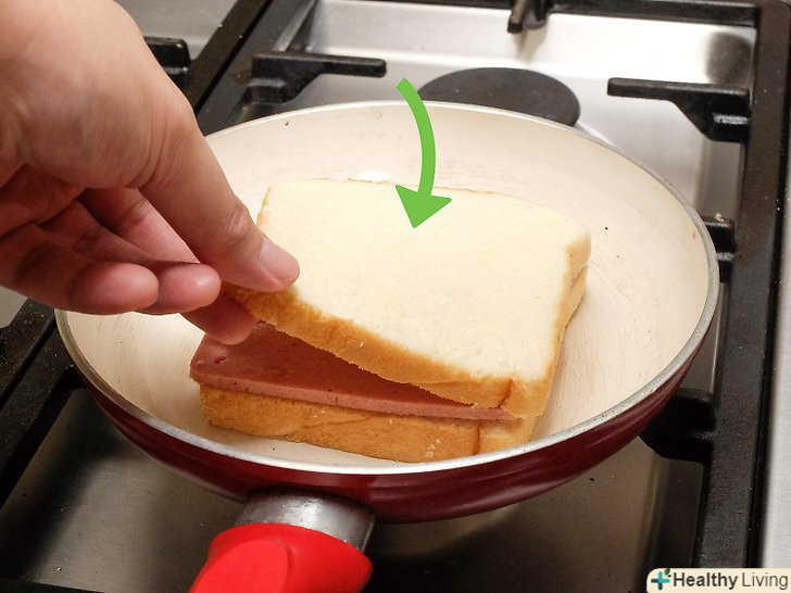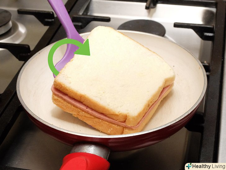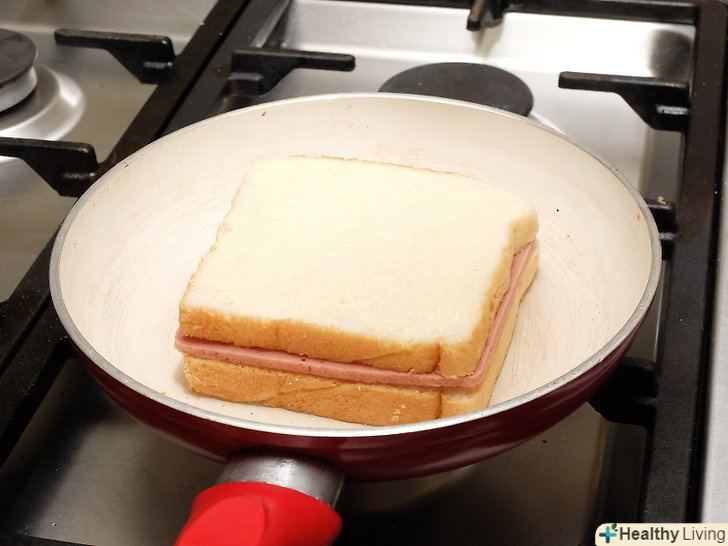 Обсмажуйте сендвіч, поки нижній шматочок хліба не придбає світло-коричневий відтінок.це займе 2-3 хвилини. Перевірити готовність сендвіча можна і за станом сиру: якщо він почав плавитися, сендвіч можна перевертати.[9]