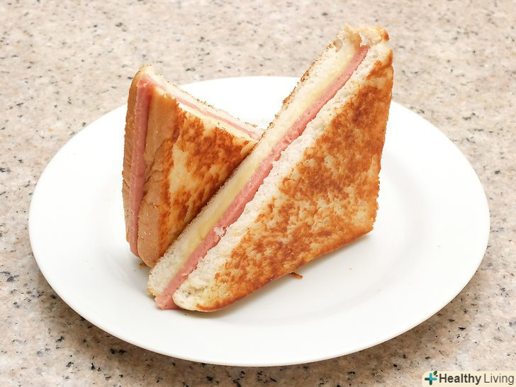 З'їжте сендвіч.за допомогою лопатки перемістіть сендвіч зі сковороди на тарілку. Можна їсти його цілим або розрізати навпіл вертикально або по діагоналі.