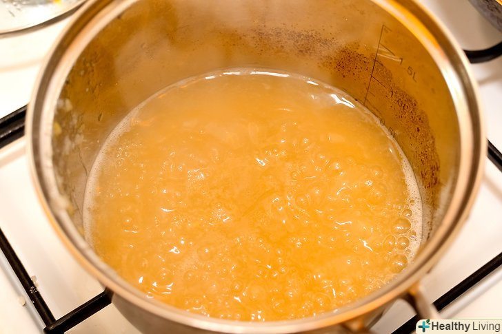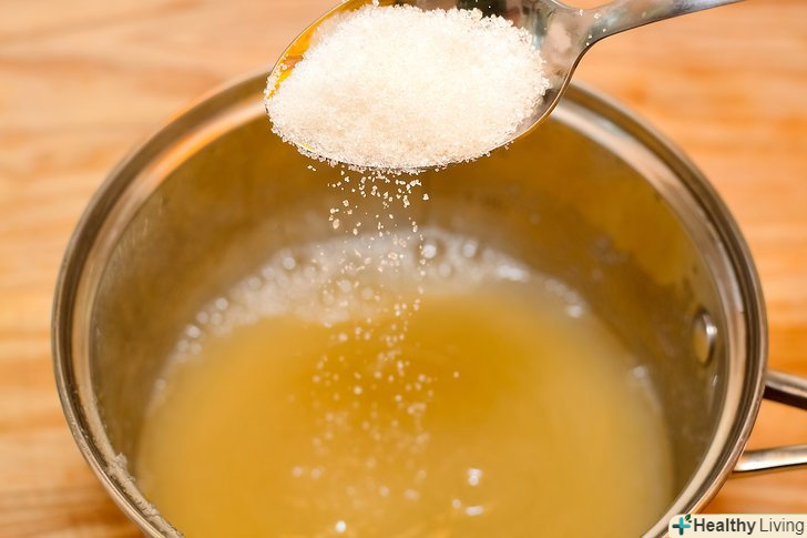 Додайте в сік цукор.Виміряйте кількість соку, як тільки закінчите проціджувати айву. Перелийте його у велику, чисту каструлю. На кожну склянку соку додайте трохи менше склянки цукру і перемішайте.- Якщо ви любите дуже солодке желе, додайте повний стакан цукру на кожну склянку соку.