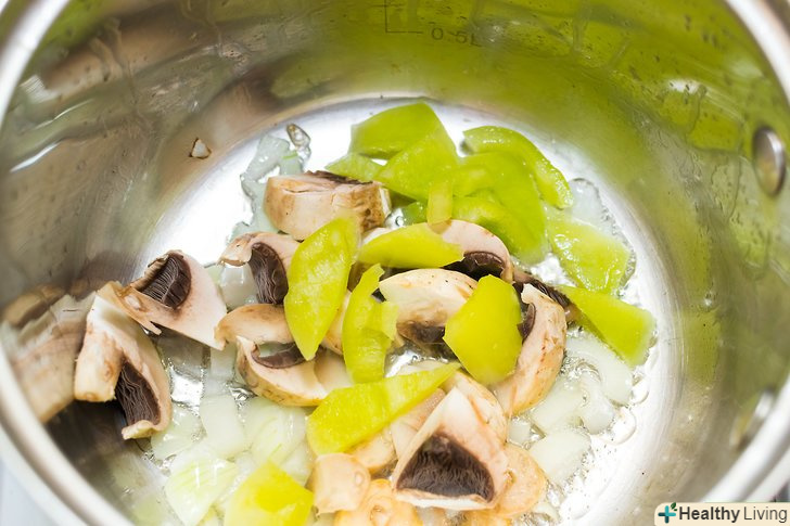 Додайте цибулю, перець, гриби або будь-який інший овоч або пряність в каструлю (за бажанням).обсмажте цибулю, поки він не стане прозорим, але простежте, щоб він не підгорів. Тушкуйте перець і інші овочі разом з цибулею.