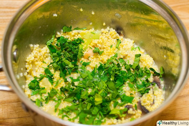 Зваріть кіноа.налийте в каструлю 2 частини води або бульйону на одну частину кіноа, поставте каструлю на середній вогонь і доведіть до кипіння. Накрийте кришкою і зменшіть вогонь. Варіть кіноа на повільному вогні близько 15 хвилин або до того, поки зерна не стануть прозорими, а білий зачаток не сформує видиму спіраль на зовнішній поверхні зерна.- Постарайтеся приготувати кіноа al dente, як пасту. Не забувайте, що кіноа буде продовжувати варитися ще трохи навіть після того, як ви зніміть каструлю з вогню.
