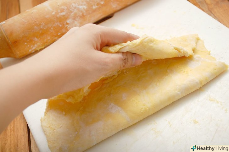 Розкачайте тісто у формі прямокутника з довгими сторонами по горизонталі.- Загорніть третину прямокутника і покладіть на решту.{largeimage|Make Puff Pastry Step 9.jpg}}