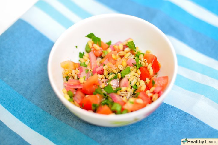 Подавайте фарро в якості антипасти.приготуйте фарро та інші інгредієнти окремо, перш ніж змішати їх і подати.- Змішайте готовий фарро з 1/4 склянки (60 мл) подрібненої червоної цибулі, 1/4 склянки (60 мл) нарізаних кубиками помідор, 2 ст.л. (30 мл) оливкової олії і винним оцтом за смаком.