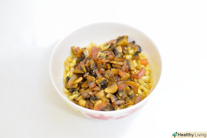 Змішайте з обсмаженими грибами.Портобелло і лісові гриби можуть бути змішані з теплим готовим фарро.- Налийте в сковороду трохи оливкової олії. Обсмажте товсті гриби портобелло або дикі гриби з дрібно нарізаною цибулею.